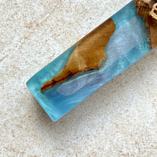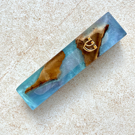 Experience the rich history and unique craftsmanship behind our handcrafted mezuzah case, a perfect blend of dedication and ingenuity. From the rich tones of Israeli Olive Wood and shimmering turquoise epoxy resin, this mezuzah is a beautiful testament to the unwavering faith of Judaism, exuding both sophistication and resilience. The delicate golden "Shin" adds an elegant touch, making this mezuzah a cherished protector and stunning adornment for any Jewish home.
