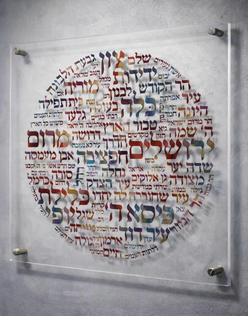 Each word represents one of Jerusalem’s many names throughout history — Yerushalayim, Zion, Ariel, Ir David, City of Peace — forming a visual prayer and a timeless tribute to the holy city.