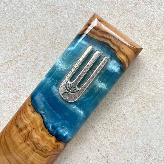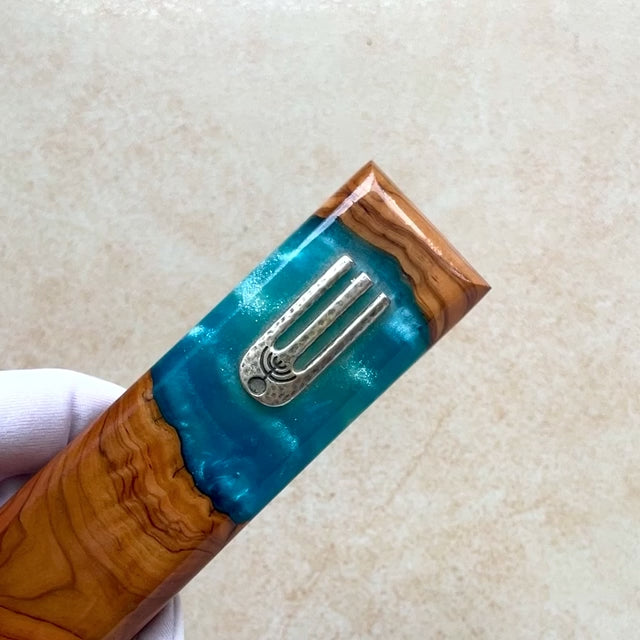 Discover the powerful roots of our oversized Klaf 20" handmade mezuzah case, a symbol of devotion and imagination. The fusion of Israeli Olive Wood and Epoxy resin creates a sturdy tribute to Jewish faith, exuding elegance and resilience. The intricate "Shin" in precious metal adds a touch of refinement to this mezuzah, elevating it to a sacred guardian and a gorgeous adornment for any Jewish home.